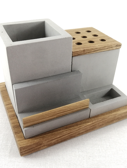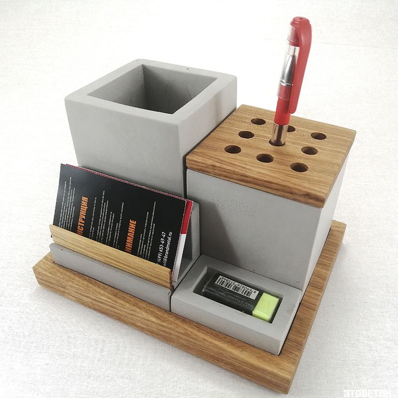 Офисный органайзер изготовлен из композитного бетона. Включает в себя чытыре самостоятельных предмета на подставке из массива хвои. Каждый предмет может использоваться как самостоятельно, так и в композиции. Состав комплекта:
