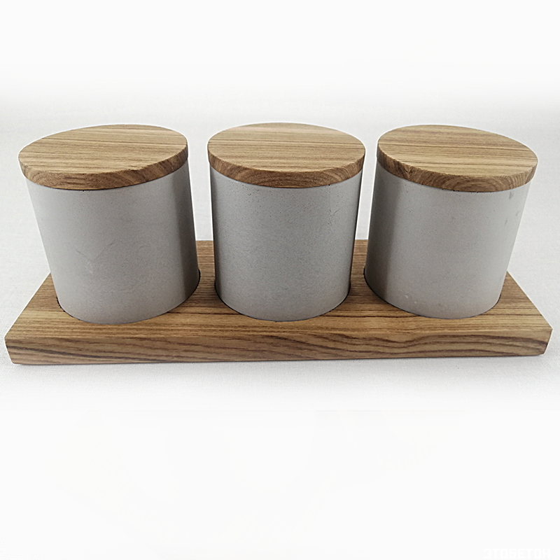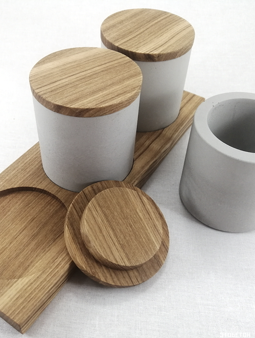 Комплект баночек-шкатулок из композитного бетона с деревянной крышкой и поддоном из хвои.